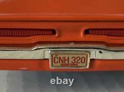 This is a vintage 1981 Dukes of Hazzard General Lee car, made by Ertl in 1:24 scale. The car is part of the ERTL American Muscle series and features a Warner Bros. The car is colored orange, with a Dodge Charger R/T model and a 1969 year of manufacture. The car is made of tin and has not been autographed.