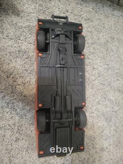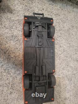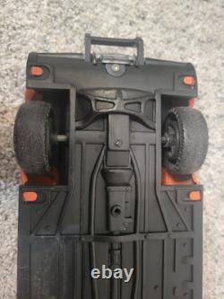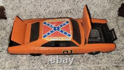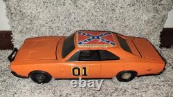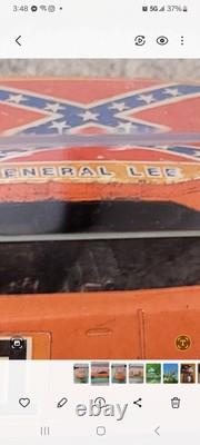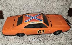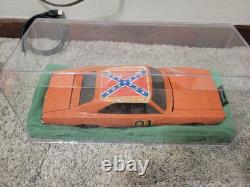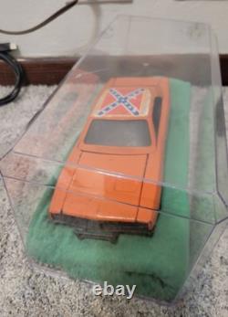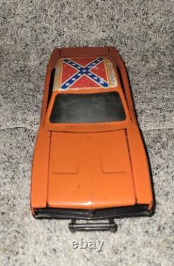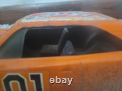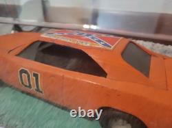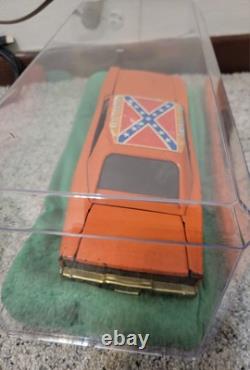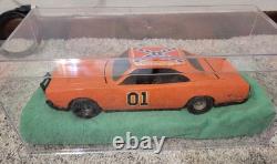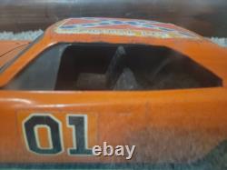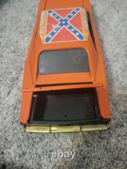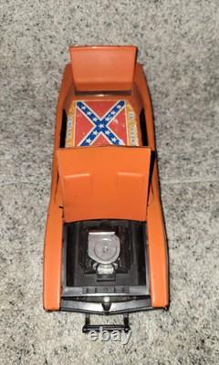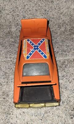 This is a vintage 1981 "Tin General" model of the General Lee car from The Dukes of Hazzard series. The vehicle is a 1:16 scale replica of a Dodge car, with an orange color and tin material.